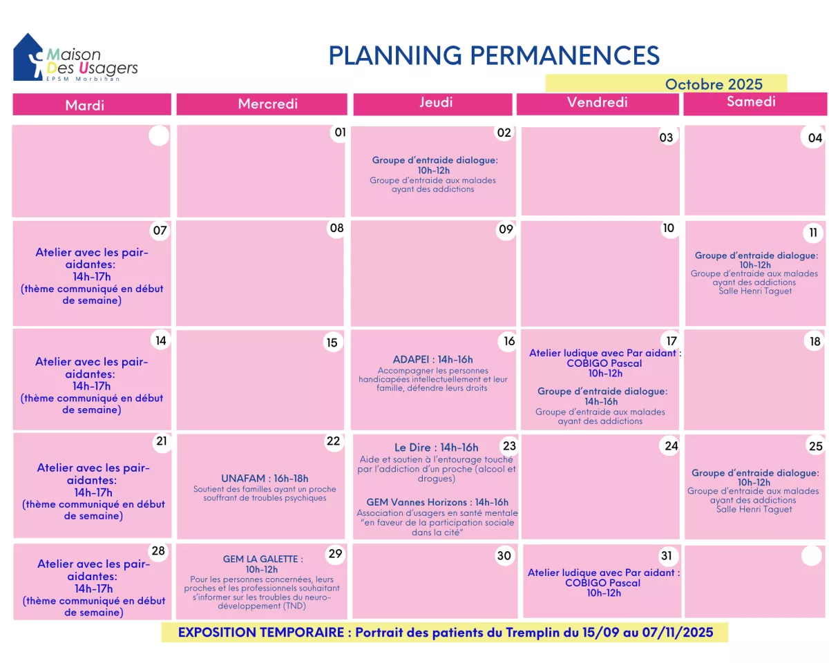 Des associations et Groupe d'Entraide Mutuelle tiennent des permanences du mercredi au vendredi, selon un planning défini.