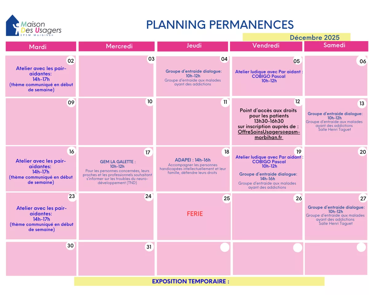 Des associations et Groupe d'Entraide Mutuelle tiennent des permanences du mercredi au vendredi, selon un planning défini.
